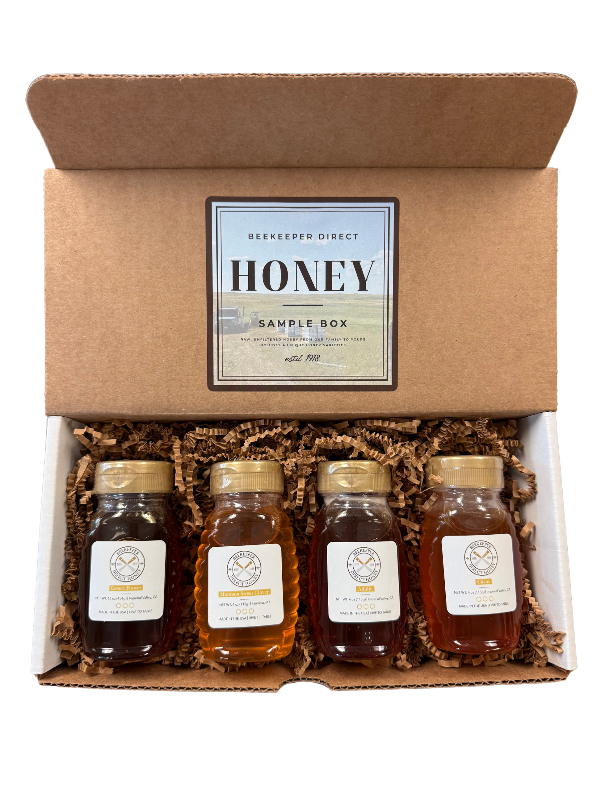 Experience the pure taste of American honey with this curated sampler box, featuring four 4oz jars of our signature varieties. From the sunny blossoms of Southern California to the wide-open clover plains of Montana, each honey reflects the unique region it’s harvested from. Ranging from light and floral to rich and bold, this collection is the perfect way to explore our honey, share as a thoughtful gift, or enjoy a tasting journey straight from the hive.